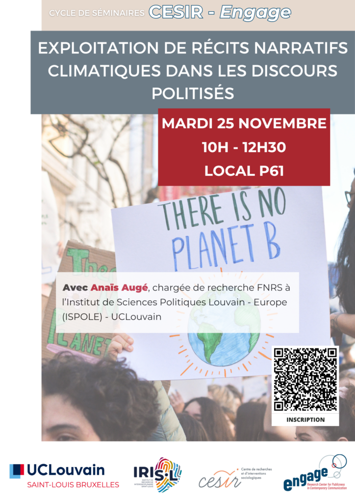 Cette présentation d’Anaïs Augé, chargée de recherche FNRS à l’Institut de Sciences Politiques Louvain – Europe (ISPOLE), propose d’identifier les variations narratives pouvant être observées dans les discours climatiques à travers le temps (1980-2025) et les genres discursifs (scientifique, politique, activisme, média).
