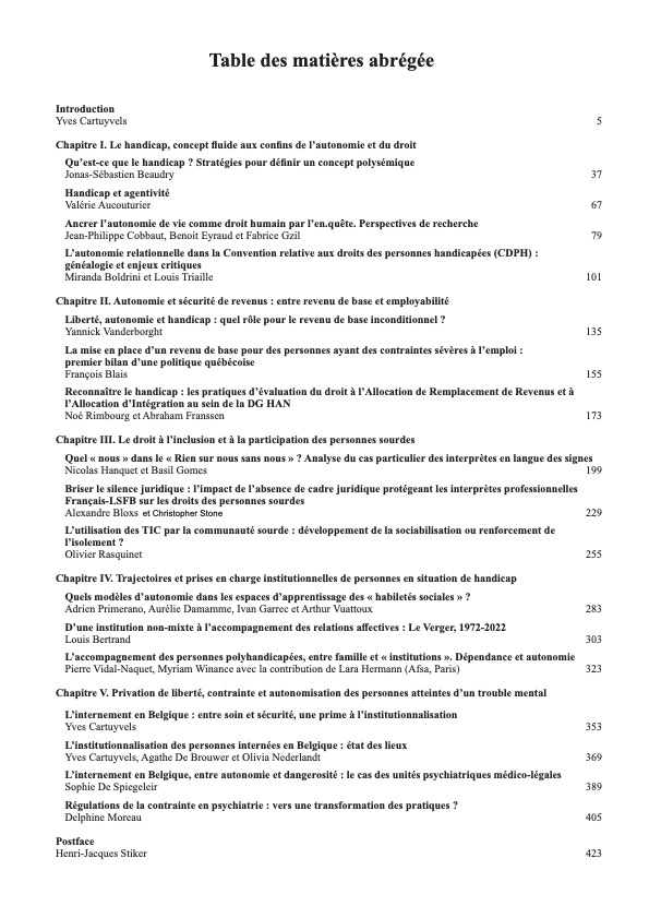 Sur fond d’une réflexion générale sur les concepts de handicap et d’autonomie, l’ouvrage décline cette question à travers 4 axes thématiques : l’autonomie financière des personnes en situation de handicap et ses modalités de mise en oeuvre ; le droit à l’inclusion des personnes sourdes et malentendantes ; les trajectoires institutionnelles des personnes en situation de handicap ; la privation de liberté et le recours à la contrainte utilisés dans la prise en charge des auteurs d’infraction atteints d’un trouble mental ou « handicap psychosocial ».