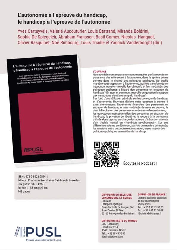 Sur fond d’une réflexion générale sur les concepts de handicap et d’autonomie, l’ouvrage décline cette question à travers 4 axes thématiques : l’autonomie financière des personnes en situation de handicap et ses modalités de mise en oeuvre ; le droit à l’inclusion des personnes sourdes et malentendantes ; les trajectoires institutionnelles des personnes en situation de handicap ; la privation de liberté et le recours à la contrainte utilisés dans la prise en charge des auteurs d’infraction atteints d’un trouble mental ou « handicap psychosocial ».