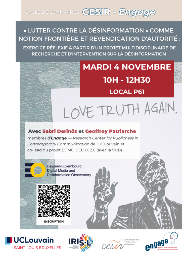 Dans les milieux politiques, éducatifs et journalistiques, notamment, la « désinformation » est devenue une préoccupation majeure, souvent articulée au diagnostic d’une crise des institutions et des processus démocratiques. De multiples initiatives visant à « lutter contre la désinformation » ont vu le jour. Cette présentation, animée par Sabri Derinöz et Geoffroy Patriarche, prend pour point de départ l’une d’entre elles, dans laquelle Engage est directement impliqué : EDMO BELUX, un hub multidisciplinaire de recherche et d’intervention sur la désinformation en Belgique et au Luxembourg. La perspective proposée, à dominante pragmatique (Cefaï, Neveu), consiste à penser la (lutte contre la) désinformation comme un problème public constitué au croisement de discours multiples, dans des arènes publiques qui se contaminent mutuellement et dans lesquelles des acteurs négocient la désignation et la description du problème. Informé par une notion de discours comme « dire, faire et être » (Gee), l’exercice réflexif proposé explore une double hypothèse : la « lutte contre la désinformation » fonctionne à la fois comme notion frontière et comme revendication d’autorité.`